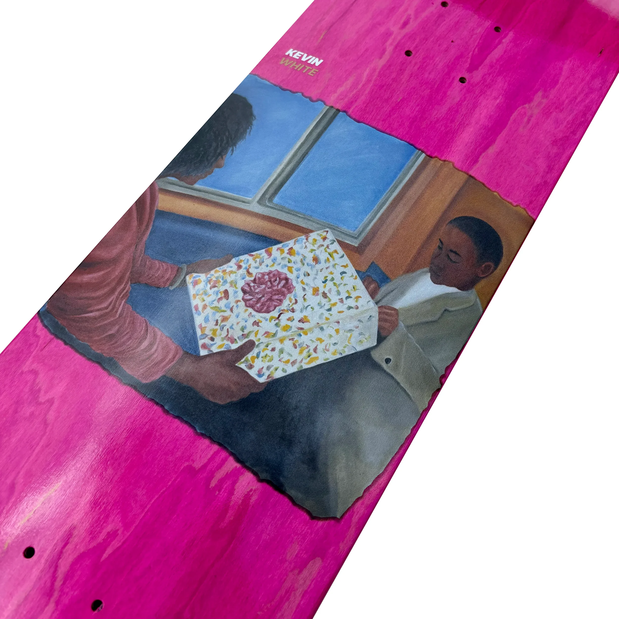 He was on Sensi for about a year before the team made it official. His first pro board came with a deeply personal graphic, a photo of him handing a gift to his mom.